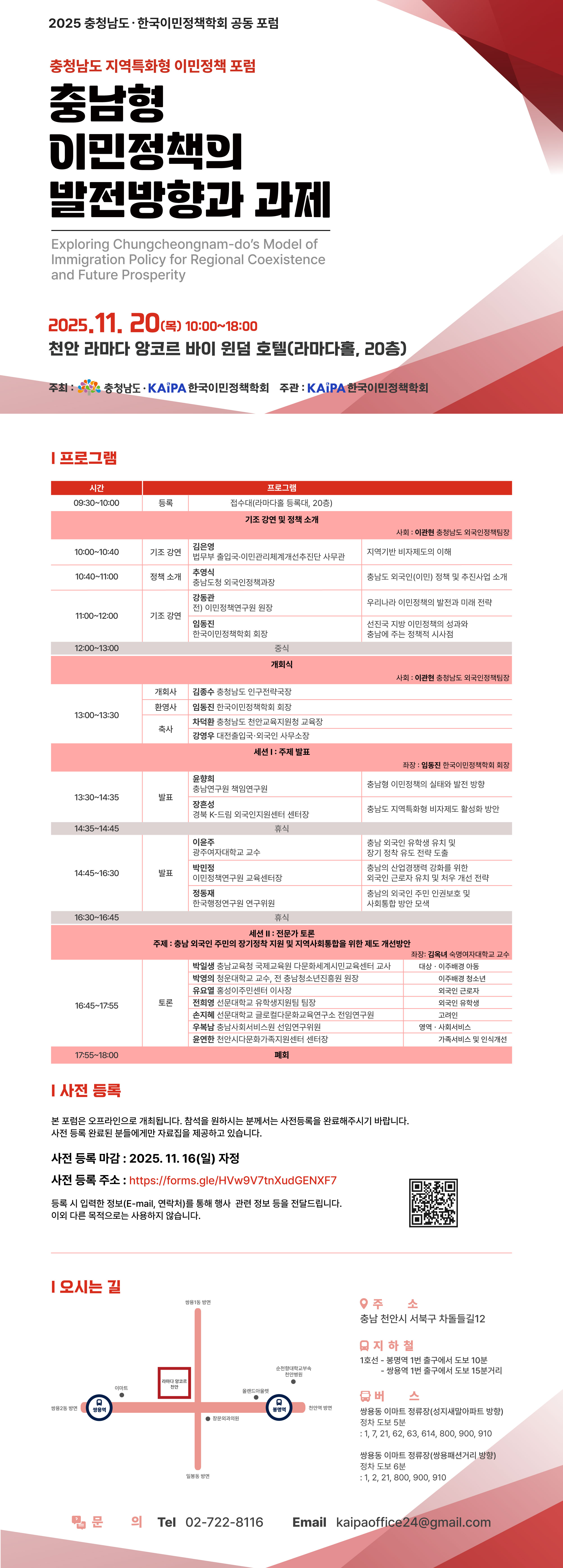 2025년 한국이민정책학회-충청남도 이민정책포럼 개최 안내(2025.11.20)