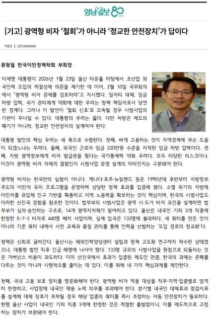 [영남일보] (2026.03.05.) 광역형 비자 철회가 아니라 정교한 안전장치가 답이다