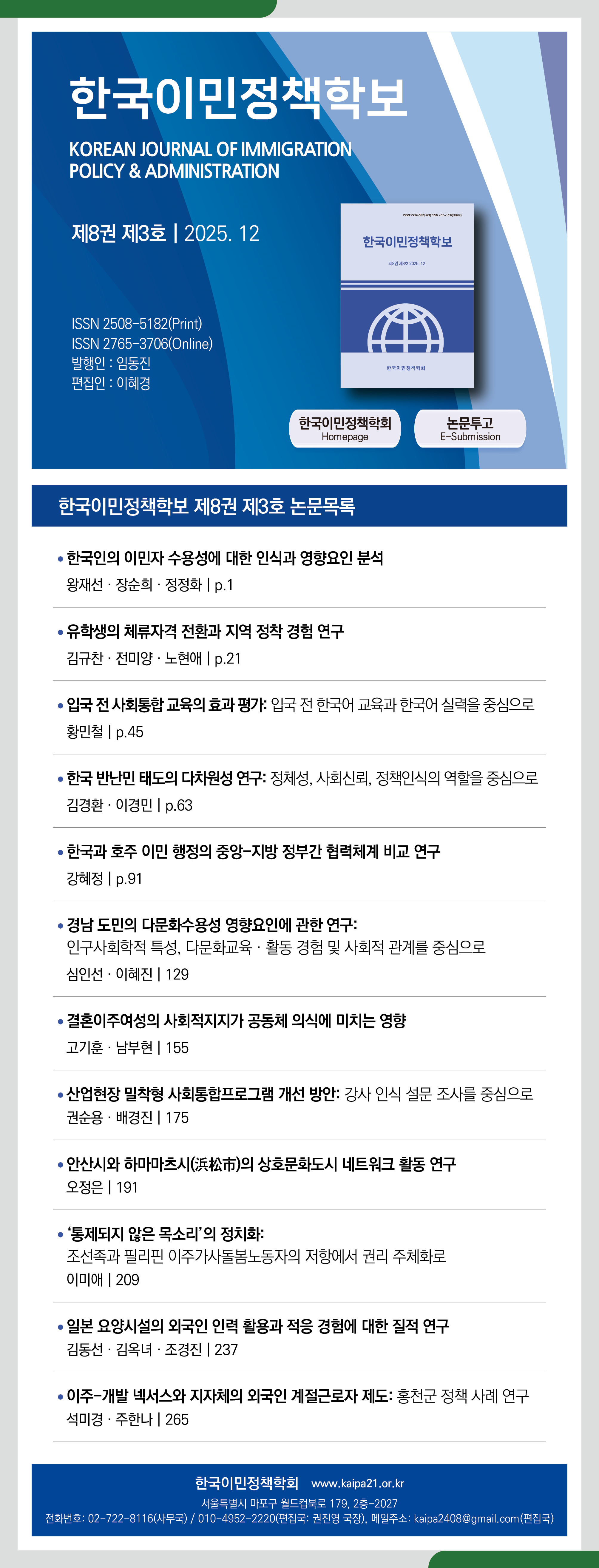한국이민정책학보 논문검색- http://www.kaipa21.or.kr/html/journal.html?journal=1<매체기사>연합뉴스 : https://www.yna.co.kr/view/AKR20260113099900371?input=1195m